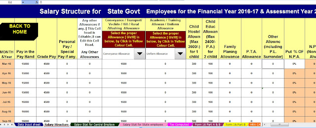 Click here to Download the Automatic All in One TDS on Salary for Central & State Govt Employees for the FY 2016-17 ( Prepare at a time Tax Compute Sheet + Individual Salary Structure + Automated HRA Exemption + Automated Form 16 Part A&B and Part B)