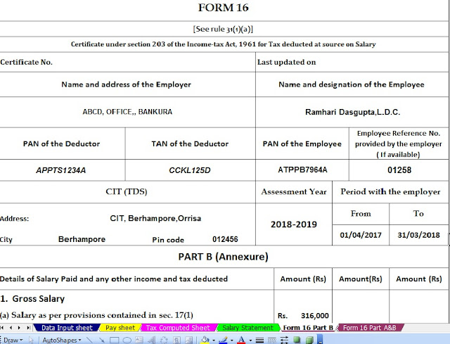 Download Automated Income Tax Preparation Excel Based All in One TDS on Salary for Only Non-Govt Employees for the Financial Year 2017-18 and Assessment Year 2018-19. [ This Excel Based Utility can prepare at a time your Individual Tax computed Sheet + Individual Salary Structure as per the Non-Govt Employees Salary Pattern + Automated H.R.A. Calculation + Automated Form 12 BA + Automated Form 16 Part A&B and Form 16 Part B as per the latest Income Tax Slab.]